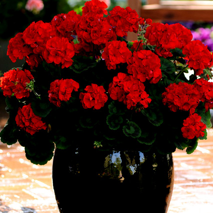 Пеларгония с листвой темного, насыщенно-шоколадного окраса и очень яркими соцветиями.